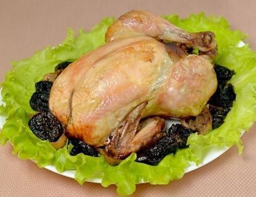 Это классический рецепт приготовления курицы, фаршированной яблоками и черносливом. Для начала подготовленная курица маринуется 30 минут в смеси из сметаны и приправ. Затем хорошенько фаршируется фруктами. Ножки связываются нитками и курица помещается в рукав для запекания. Запекать курицу необходимо около 40 минут. Готовое блюдо подавайте только в горячем виде, украсив зеленью салата. Хорошего дня!