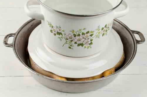2. сверху накрыть курицу тарелкой меньшего диаметра чем сковорода и поставить на нее груз (например, кастрюлю с водой. Убедитесь, что она стоит устойчиво. Обжарить таким образом курицу с двух сторон.