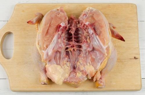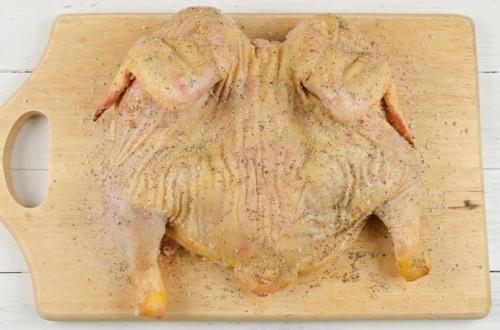 1. тушку разрезать вдоль по грудке. Посолить и поперчить с обеих сторон.