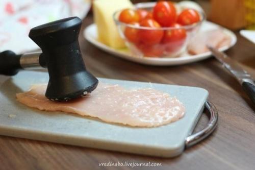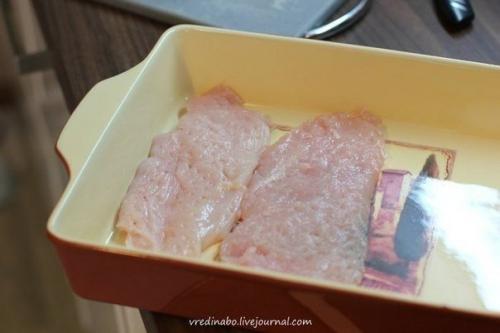 1 у куриной грудки отрезаем всё лишнее, аккуратно режем вдоль, в итоге из одной грудки получается два тоненьких куска, каждый их них слегка мы отбиваем.