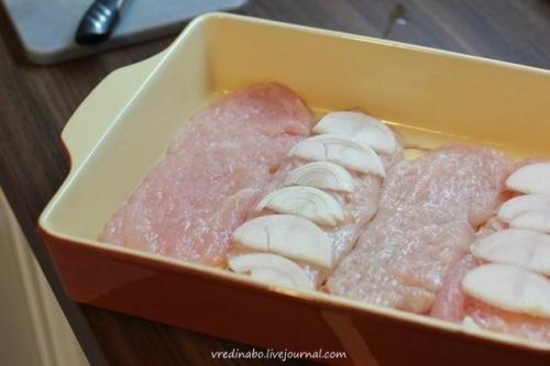 4 выкладываем полукольца лука поверх курицы (некоторые предпочитают без лука, поэтому у меня 50/50).
