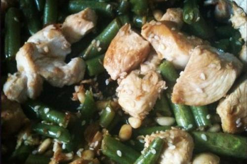 4 огонь убавить, добавить стручковую фасоль, очищенные кедровые орешки, кунжутное семя, тушить в течение 15 минут, помешивать.