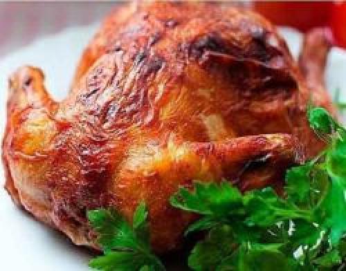 Смазать противень капелькой любого масла, выложить курицу и запекать в духовке час. Первые 40 минут при температуре 200 градусов.