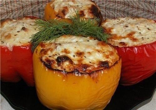 Теперь на противень, на котором будет готовится курица в перце выкладываем половинки перца. В каждую половинки уже готовую начинку с курицей накладываем.