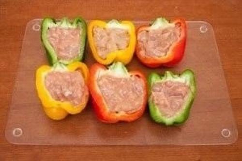 6. теперь на противень, на котором будет готовится курица в перце выкладываем половинки перца. В каждую половинки уже готовую начинку с курицей накладываем.