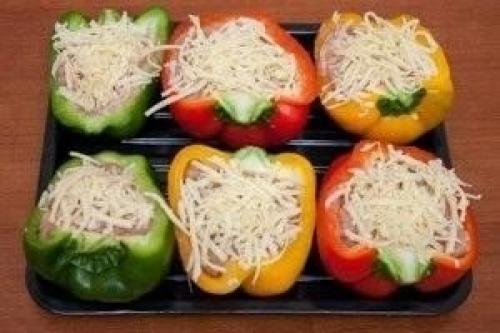 8. после 30 минут достаем противень и посыпаем каждый перец натертым сыром. Ставим еще на 10 минут - ждем, чтобы сыр расплавился и образовалась корочка. Курица готова в перце. Приятного аппетита!
