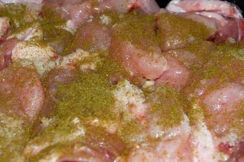 Мясо посыпать 1 чайной ложкой приправы хмели - сунели.