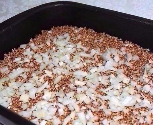 1. два стакана тщательно промытой крупы мы укладываем на смазанный маслом противень. Сверху посыпать мелко нарезанными луковицей и тремя зубчиками чеснока.