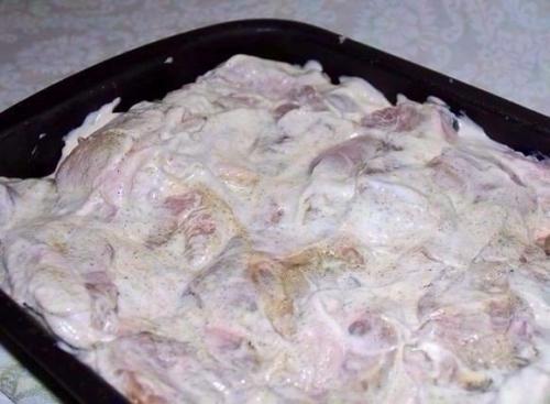 4. промазать курицу сметаной, налить 1-1, 5 стакана горячей соленой воды.