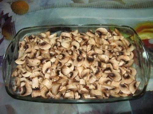 1. куриное Филе нарезать полосками или небольшими кусочками. Выложить в форму для запекания, форму предварительно смазать маслом, посолить.