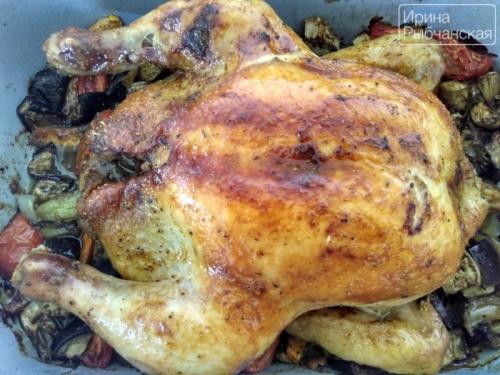 Целая курица с баклажанами в духовке.