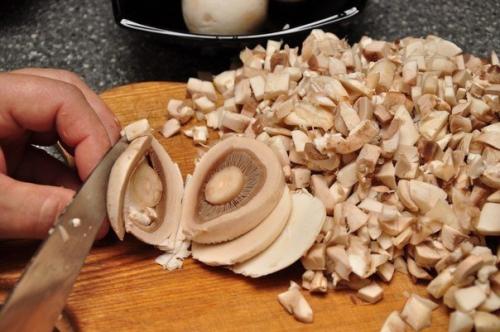 Грибы порезать кубиками и обжарить на растительном масле с измельченным луком, в конце посолить и поперчить.