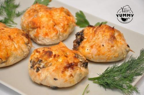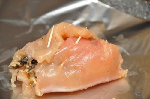 Куриное Филе отбить, посолить, поперчить. В центр положить грибной фарш, свернуть, придав форму "Бомбочки", при необходимости заколоть зубочистками. Завернуть в фольгу (фольгу предварительно смазать растительным маслом.
