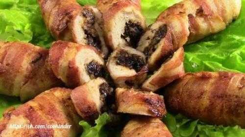 Кладем на полоску бекона и сворачиваем так, чтобы бекон обмотал весь рулетик.