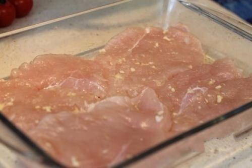 Мы разогреваем духовку до 200 с градусов. Куриное Филе моем и разрезаем вдоль на 4 стейка. Получившиеся стейки отбиваем кухонным молоточкам, солим и перчим. Затем, выдавливаем чеснок через чесночницу и растираем с двух сторон. Выкладываем стейки в форму. Преступаем к овощам. Тут нет определенной пропорции овощей, добавляйте больше тех, которые любите. Я указала примерную массу каждого ингредиента, но все по вкусу. Морковь чистим и натираем на средней терке. Лук мелко нарезаем. Перец режем на небольшие прямоугольники. Кабачок нарезаем тонкими полосочками.