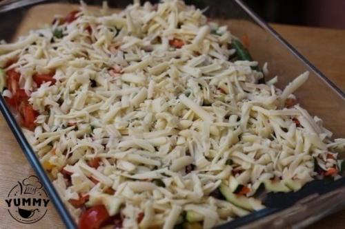 Помидоры черри режем на четвертинки. Можно использовать обычные помидоры. Все нарезанные ингредиенты перемешиваем. Добавляем к ним стручковую фасоль. Я использовала замороженную, перед добавлением промыла ее под холодной водой. Овощи немного солим, перемешиваем хорошо и выкладываем на куриное Филе. Посыпаем все тертым сыром и добавляем по краю немного воды. Ставим в разогретую духовку до 200 с градусов и запекаем минут 40 или до готовности. Приятного аппетита!