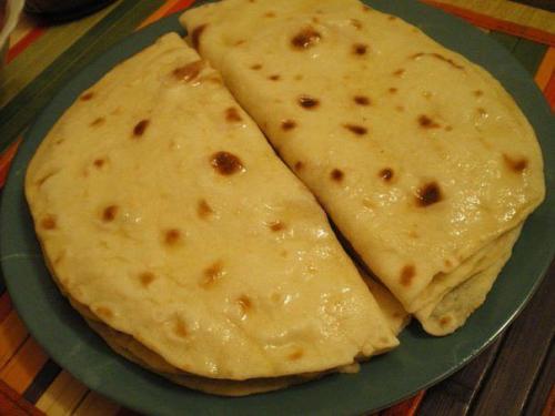 После незначительной расстойки тесто разрезать на куски весом 75 г, которые раскатать на тонкие лепешки и выпекать на раскаленной сухой сковороде до румяной корочки.