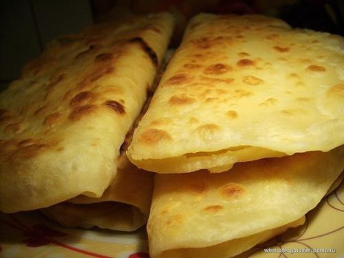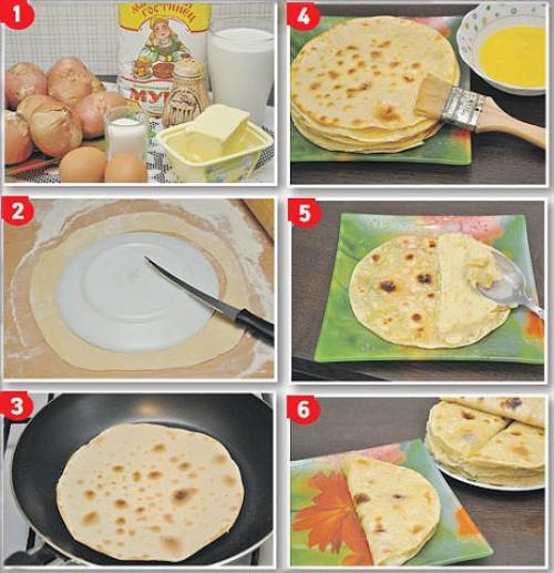 На одну половину лепешки уложить картофельную начинку, согнуть лепешку пополам и накрыть начинку второй половиной. Чтобы лепешки не ломались на изгибе, их надо начинять горячими.