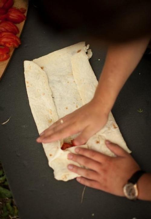 Плотно заворачиваем начинку, стараясь при этом не порвать тонкие лаваши. А сверху смазываем их растительным маслом, чтобы после обжаривания на гриле блюдо приобрело аппетитную корочку.