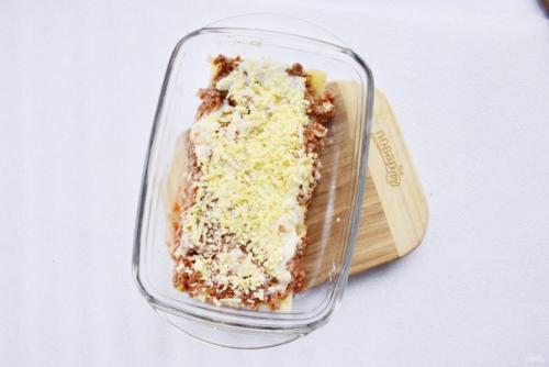 6. теперь выкладывайте лазанью слоями: лист лазаньи, мясной соус, соус "Бешамель", тертый пармезан. Старайтесь хорошо смазывать края лазаньи, чтобы при выпекании они хорошо пропитывались и не стали твердыми.
