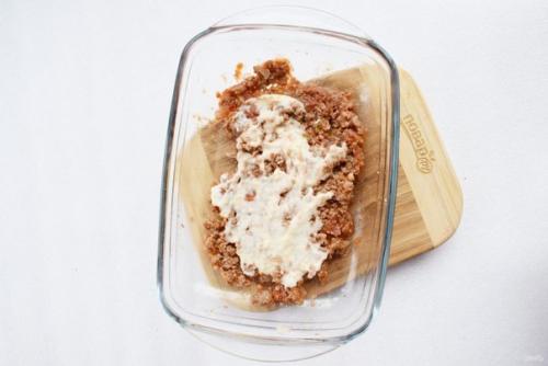 5. духовку включите на 180 градусов. На дно формы для запекания выложите немного мясного соуса и соуса "Бешамель".