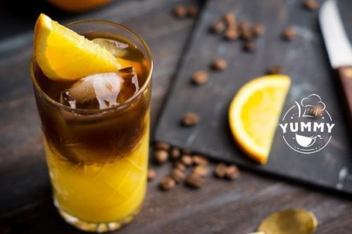 Мы закладываем кусочки апельсиновой цедры в кастрюлю с водой и сахаром. Кипятим все в течение 5 минут. Убираем кусочки цедры и охлаждаем сироп. Затем смешиваем апельсиновый сок с кофе и получившимся сиропом. Наливаем апельсиновый кофе в высокие бокалы и сверху закладываем измельченный лед. Украшаем все долькой апельсина.