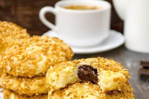 1 смешать творог, манку, яйцо, сахарозаменитель и ванилин, вымесить. Горький шоколад на кусочки поломать. Сформовать лепешку из теста, положить кусочек шоколада, защипать. Сформовать сырник, обвалять его в овсяных хлопьях и обжарить до готовности.