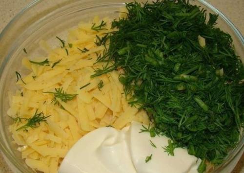 - Пюре - 200 гр. - Яйцо - 1 шт. - Майонез - 2 ст. л. - Лук зеленый - 1 пуч. - Перец. Масса - 2. - Сыр тв - 100 гр. - Майонез - 3 ст. л. - Укроп. - Перец.
