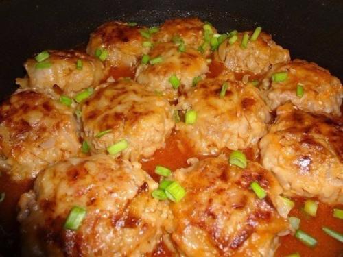 Капусту нашинковать не очень мелко, залить горячим кипятком и дать постоять 5-10 минут. Это делается для того, что бы капуста стала мягче и убрать горечь. После слить воду и отжать капусту. Смешать и посолить фарш, рис, капусту. Скатать шарики и обвалять в муке. Обжарить на подсолнечном масле с двух сторон до румяной корочки. Залить соусом и тушить 40-60 минут. Приятного аппетита!