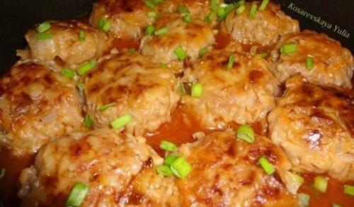 Капусту нашинковать не очень мелко, залить горячим кипятком и дать постоять 5-10 минут. Это делается для того, что бы капуста стала мягче и убрать горечь. После слить воду и отжать капусту. Смешать и посолить фарш, рис, капусту. Скатать шарики и обвалять в муке. Обжарить на подсолнечном масле с двух сторон до румяной корочки. Залить соусом и тушить 40-60 минут. Приятного аппетита!