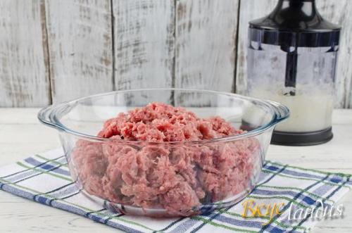 1. мы приготовим фарш для ленивых пельменей. Лук измельчите в блендере или через мясорубку. Добавьте его в миску к мясному фаршу. Посолите и поперчите по вкусу. Хорошо перемешайте фарш.