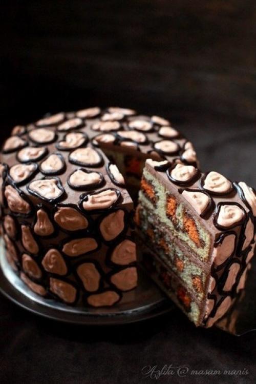 Приготовим масляный крем: сбейте сливочное масло с сахарной пудрой (отделите 100 гр крема для украшения), и добавьте растопленный на паровой бане шоколад ( оставьте 50 гр шоколада на украшение. Размешайте до полного растворения. Коржи кремом смажьте. Украсьте пятнами как на фото. Приятного аппетита!