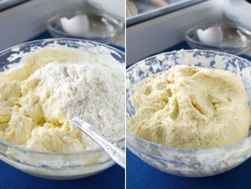 Муку смешать с разрыхлителем, солью и сахаром, добавить к массе из творога, масла и яйца. Замесить тесто. Оно должно пластичным и не очень крутым получиться.
