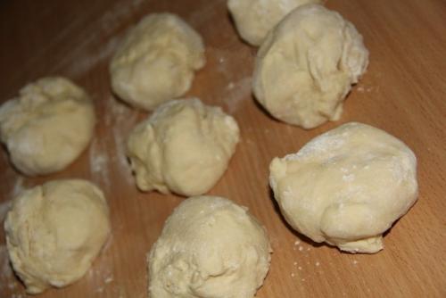 Подошедшее тесто переложить на присыпанную мукой поверхность, обмять и разделить на 8-10 частей.