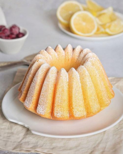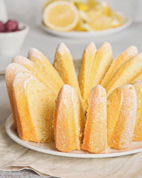В миске взбить желтки с сахаром до бела. Постепенно добавить цедру и сок лимона, растопленное масло, просеянную муку и разрыхлитель.