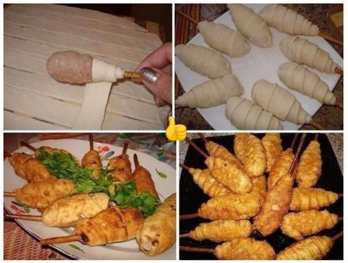 5. затем полоской теста обкрутить вокруг фарша, начиная с средины соломки и получится "Куриная Ножка".
