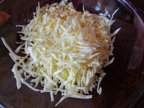 Ополоснем и нашинкуем капусту как на борщ, можно мельче.