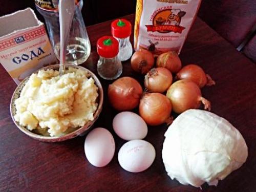 Луковые котлеты с картошкой и капустой.