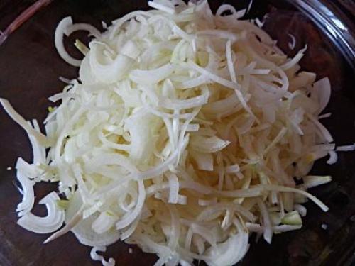 Затем почистим и тонкими полукольцами порежем лук (можно измельчить в блендере, но котлетки получатся ощутимо горьковатые, поэтому лучше порезать так).