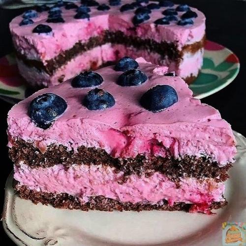 Белок взбиваем до плотной пены и вводим растворённый желатин, продолжая взбивать соединяем все и тщательно перемешиваем собираем тортик. Корж->крем->корж->крем и ягодки. Ставим в холодильник застывать.