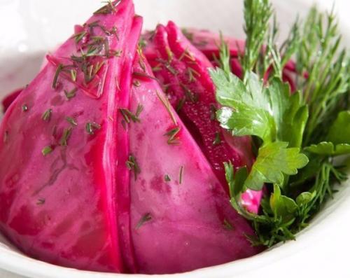 Кочан белой капусты, ? Свекла, ? Чеснок, ? Стручок горького перца, ? Чёрный горошком перец, ? Соль, ? Крутой кипяток.