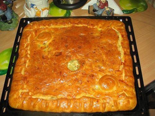 Сверху раскатать вторую, большую часть теста и накрыть пирог, края защипнуть и, если получится, свернуть косичкой.