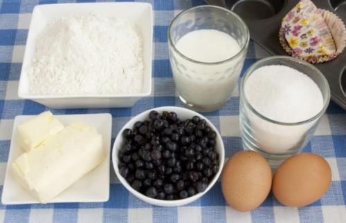 Набор продуктов для приготовления маффинов нужен совсем незатейливый - мука - масло - молоко - сахар - яйца. Соль - для баланса вкуса, ванильный сахар - для аромата (с натуральной ванилью - в идеале), разрыхлитель для пышности. И ягоды! У меня черника.