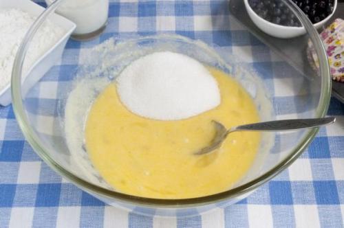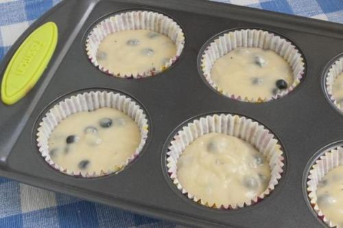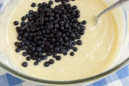 5. чернику промыть, откинуть на сито, дать стечь воде. Добавить в тесто. Перемешать, чтобы ягоды равномерно распределились по тесту. Важно не раздавить ягоды при перемешивании.