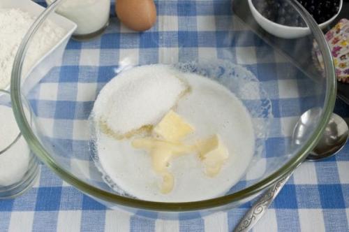 1. масло положить в миску, где будет замешиваться тесто. В микроволновке слегка растопить его, даже скорее подтопить. Добавить половину сахара, соль, ванильный сахар, перемешать.