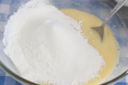4. муку соединить с разрыхлителем. Просеять все вместе в миску с тестом. Перемешать.