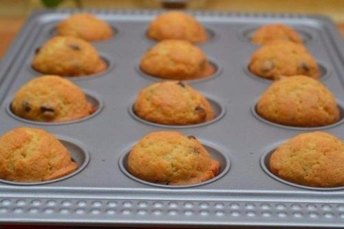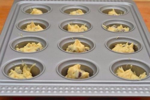 7. заполните формочки тестом на 2/3 и отправьте в предварительно разогретую духовку на 25 минут, пока "Шапочки" маффинов не станут золотистого цвета.
