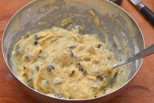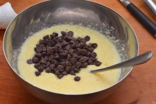 4. в полученную массу добавьте шоколад и ванильную эссенцию и аккуратно перемешайте.