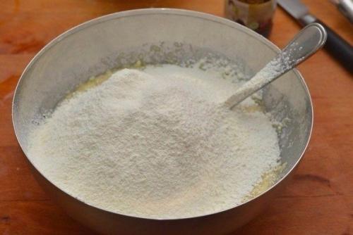 5. смешайте муку и разрыхлитель, просейте её в массу.