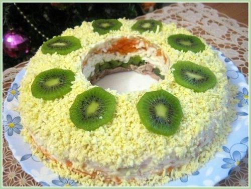 Салат для пропитки в холодильнике минимум на час оставить. Потом аккуратно вынимаем банку, а верх салата украшаем кружочками киви.